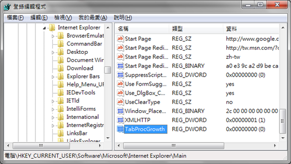只要在 HKCU\Software\Microsoft\Internet Explorer\Main 底下新增一個名為 TabProcGrowth 的 DWORD 值,並將其值設為 0 即可。
