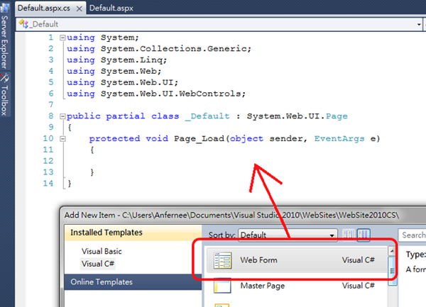 平常用 Visual Studio 新增檔案的時候(例如:aspx、cs...),Visual Studio都會很聰明的產生出一模一樣的檔案,例如下面這張圖: